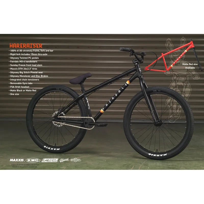 After successfully introducing the Hareraiser frame, we were asked many times for a complete bike. The frame continues to be a fully capable 26″ DJ frame is made of 100% 4130 chromoly with a 3/8″ axle slot, integrated chain tensioners, BSA 73mm threaded bottom bracket, ultra-short chainstays and a tapered 1-1/8” to 1-1/2” head tube with removable tabs for a traditional BMX-style Gyro.