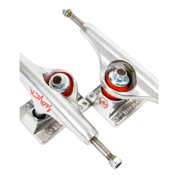 The Independent x Slayer standard trucks feature the clean, classic polished finish indy are known for with a blood-red slayer graphic on the front of the hanger and inside of the baseplate. The bushing and lock tight in the nuts also match the red graphics.
