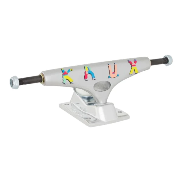 The Krux K5 DLK (Down-Low Kingpin) Truck has all the improved features of our K5 standard truck including the Pur-fect Turn, quicker turning geometry, a new pivot shape & more durable injection molded pivot cup, with a revolutionary inverted kingpin that locks into a shaft-nut in the baseplate, for ultimate grind clearance, strength and rigidity