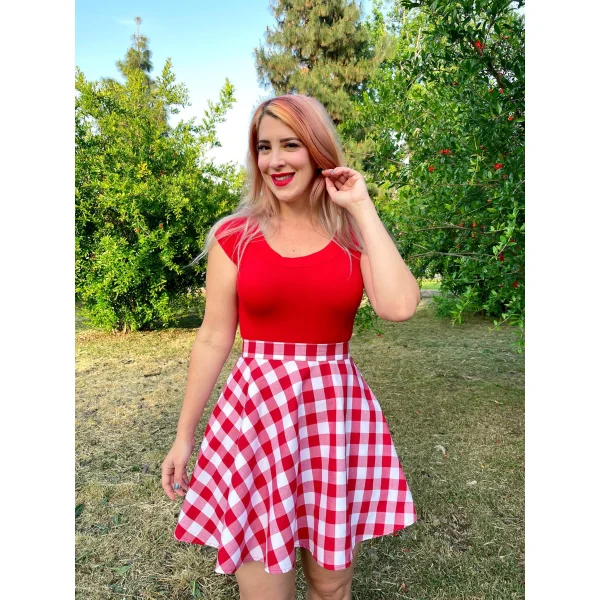 The ultimate fun and flirty skirt! Shown in our adorable red gingham print, this vintage style skirt features an elasticized back waist for ease of wear and a back zippered closure. Shown with our red boat neck top.