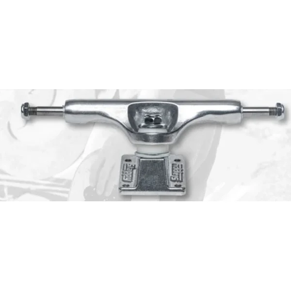 Slappy Trucks. ST1 hollow standard polished trucks. Hollow king pin and hollow axle. Polished baseplate and hanger. No break in time. Better grind clearance. Less wheel bite. 100% more fun!