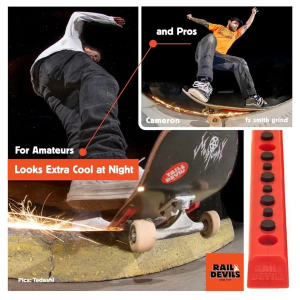 - 🔥 SPARK IT UP WITH RAIL DEVILS: 28 spark producing flint cylinders are infused upon the face of each Rail Devil. Evenly spread across the whole sliding surface to maximize sparks during any slide trick variation. Hit a lipslide, boardslide or a properly dipped smith grind and watch the sparks fly! Looks extra cool at night.