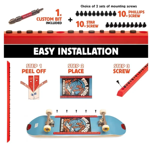 - 🔥 UNIQUE FEATURES & PROGRESSIVE DESIGN: Adhesive 3M tape backing to help with installation and to prevent rattling while skating. Rail Devils are the only skateboard deck rails that include a bit and come with two different sets of self-tapping wood screws to chose from. 10 Phillips-head or 10 Star Head mounting screws. The included bit is a custom made double ended bit; Phillips #2 on one end and Star T-10 on the other.