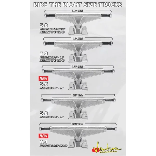 Lightweight, durable, smooth grinds and turns the way you want it to. The Venture OG Polished High Trucks are a top quality truck that is manufactured with a forged baseplate with reinforced steel kingpins and axels with top quality bushings to give you the best turn radius you can get. Designed with Venture detailing on the baseplate.